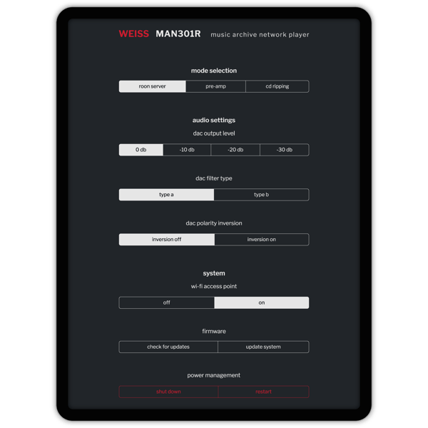 The MAN301R provides a single access point to your entire music library. Play back and archive music on NAS drives, stream music from the internet, play Internet Radio Stations, rip CDs, get cover art and metadata — and control it all via the ROON interface and the Weiss web interface.
