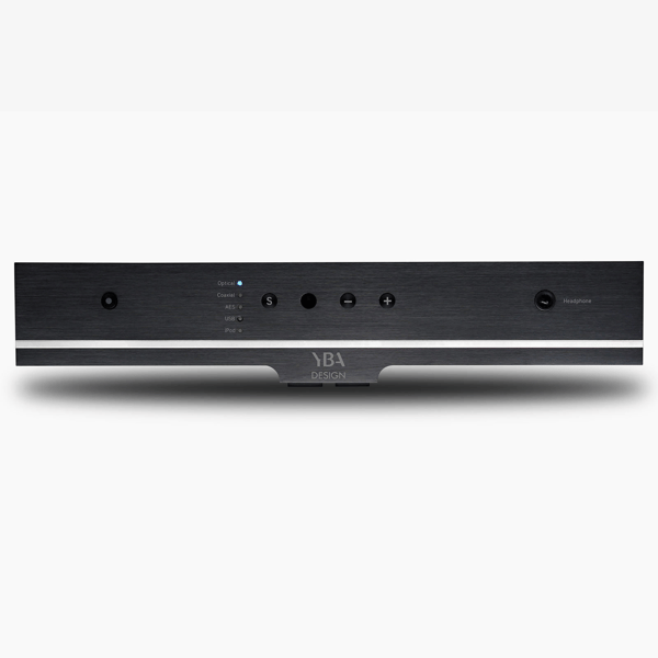 The WD202 DAC from YBA has a width of 32 cm and the single frame aluminium casing is made from a stylish black metal. On the front alongside the power button is a row of blue LEDs indicating the current source. To choose between the five sources (Optical [ Coaxial [ AES/EBU [ USB [ iPod), a push button is positioned nearby. An IR window and two controls for volume plus a headphone jack complete the front panel. If headphones are connected, the volume keys will modify the output volume of the headphones only, as the output of the XLR and RCA is automatically muted when headphones are detected. A remote control comes as standard with the DAC.